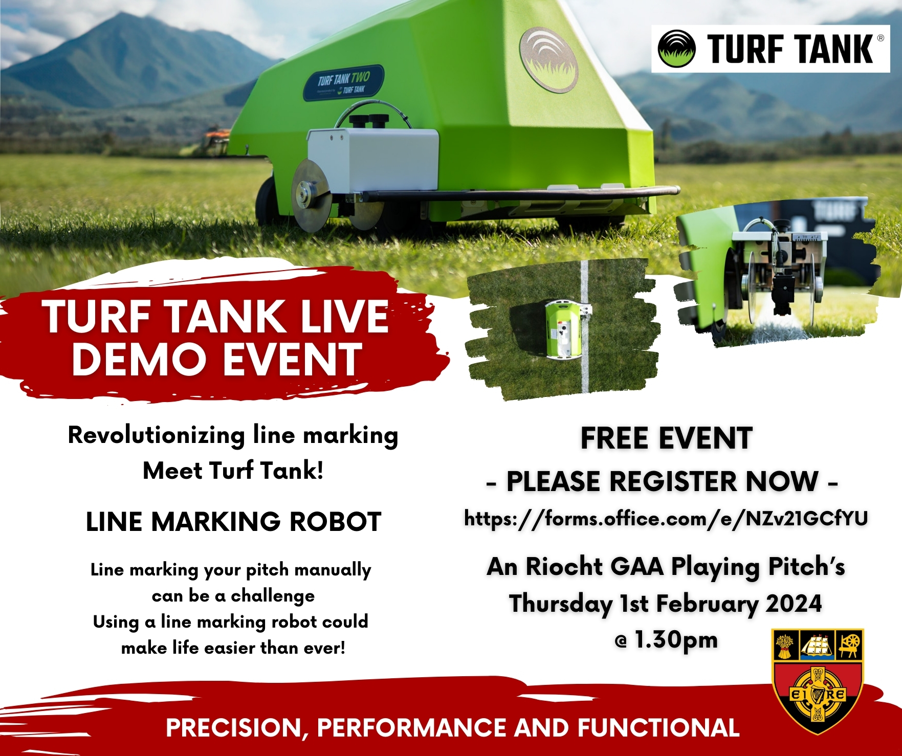 Turf Tank in association with Down GAA will be hosting a Demo event of their revolutionising line marking robot in An Riocht GAA on Thursday 1st February @ 1.30pm.